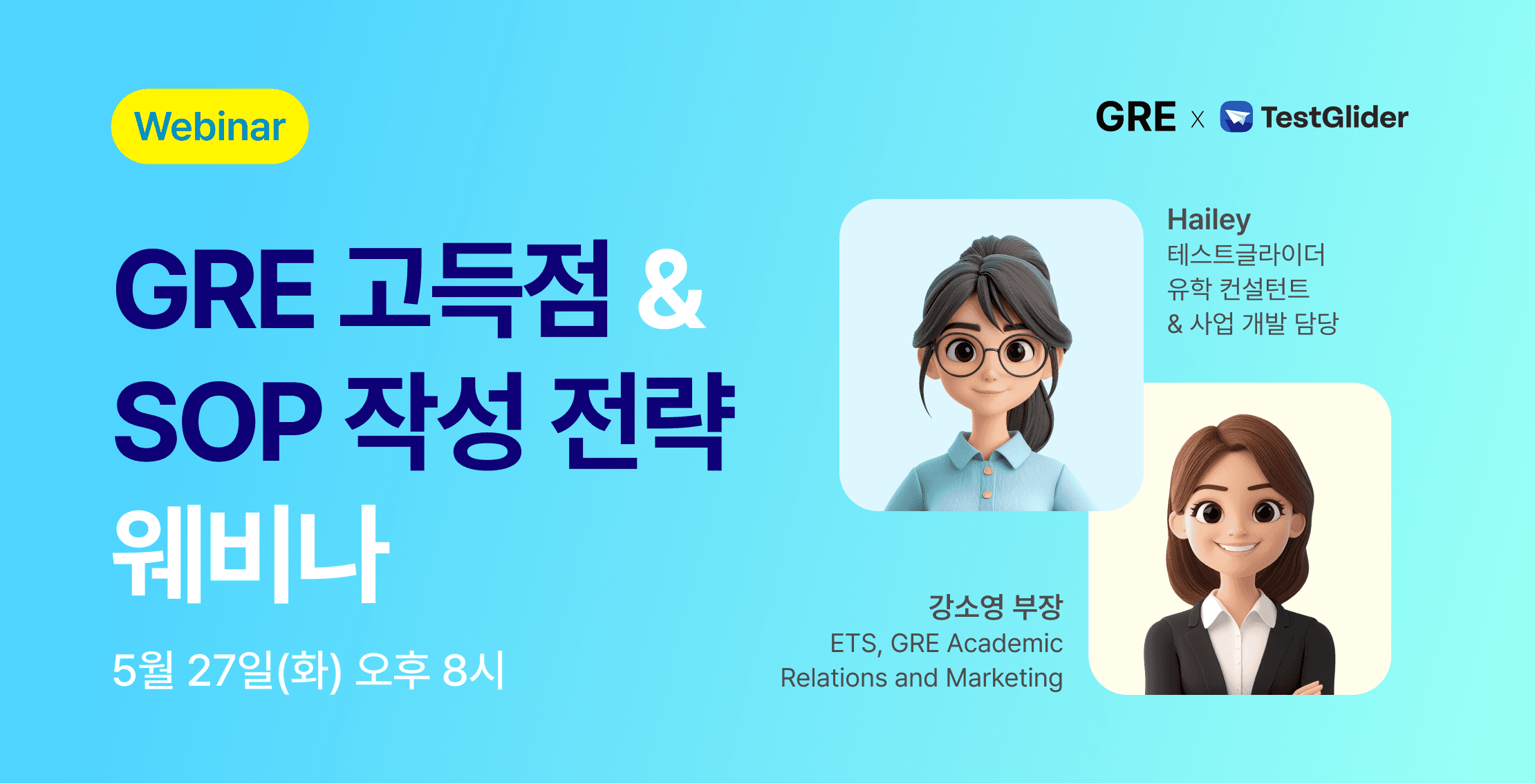 성공적인 석·박사 유학을 꿈꾸고 있다면, 이번 기회 놓치지 마세요. ETS와 테스트글라이더가 함께하는 특별 웨비나에서 GRE 고득점 비법과 대학원 지원서(SOP/PS) 작성 전략을 무료로 공개합니다!